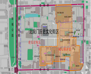 北院門歷史文化街區(qū)是西安市歷史文化名城的重要組成部分,是西安市明清長(zhǎng)安城內(nèi)三大歷史文化街區(qū)中面積最大、歷史文化遺存最為豐富的歷史文化街區(qū),其核心保護(hù)區(qū)范圍東至社會(huì)路,西至灑金橋,南臨西大街,北至蓮湖路,面積約73.4公頃;其建設(shè)控制區(qū)東至北大街,西至西安城墻,南至西大街,北到蓮湖路,面積約224公頃。該歷史文化街區(qū)內(nèi)有鐘樓、鼓樓、化覺巷清真寺和都城隍廟等國(guó)家級(jí)保護(hù)文物單位6處,省級(jí)文保單位6處,市級(jí)文保單位2處。保持著較為完整的明清街巷院落格局與肌理,是西安歷史街區(qū)的典型代表。