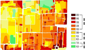 用地性質(zhì)和功能方面,按照功能的重要性分為重點(diǎn)地區(qū)、一般地區(qū)和隔離疏散場(chǎng)所,火災(zāi)危險(xiǎn)性打分分別為4分、2分和0分;人口密度參考相關(guān)規(guī)范和國(guó)內(nèi)其他城市老城區(qū)人口密度情況,分為高、中、低等三個(gè)等級(jí),高密度區(qū)位200人/公頃以上,打分為3分,中密度區(qū)為115-200人/公頃,打分為2分,低密度區(qū)為115人/公頃以下,打分為1分;建筑密度主要參考《陜西省城市規(guī)劃管理技術(shù)規(guī)定》(陜建發(fā)【2017】473號(hào)),建筑密度低于30%為低密度區(qū),打分為1分,建筑密度30%-60%為中密度區(qū),打分為2分,建筑密度大于60%為高密度區(qū),打分為3分;歷史文化價(jià)值分為高、中、低三個(gè)等級(jí),高價(jià)值區(qū)主要包括市級(jí)以上文保單位,打分為3分,中價(jià)值區(qū)為歷史文化街區(qū)核心區(qū)的其他地區(qū),打分為2分,低價(jià)值區(qū)為歷史文化街區(qū)建設(shè)控制區(qū)的其他地區(qū),打分為1分;人流熱力圖主要參考百度地圖的熱力圖,分為高、中、低三個(gè)等級(jí),打分分別為3分、2分和1分。賦值越高火災(zāi)危險(xiǎn)性越大,反之風(fēng)險(xiǎn)性則越小。