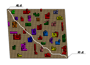 (xs,ys),(xf,yf)分別代表路徑起始點與終點坐標(biāo)。此設(shè)計將兩個因素綜合在一個函數(shù)中,實現(xiàn)了量化的統(tǒng)一。路徑長度越小,與障礙相交次數(shù)越少,則適應(yīng)度函數(shù)值越大。