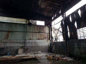 起火單位是陜西某汽車零配件銷售公司,主要經(jīng)營汽車配件,起火建筑為單層鋼結(jié)構(gòu)建筑,建筑面積2000平方米,南北長60米,東西長35米,從中間分隔后分為兩個庫房,其中靠東邊的庫房租賃給湖北十堰某汽車配件公司做庫房,剩余部分自己使用,東北側(cè)為某鈦板加工廠,東南側(cè)為某鈦棒打磨廠,西側(cè)為某鍛熱機械公司(見圖1)。其中陜西某汽車零配件公司和湖北十堰某汽車配件公司兩個庫房全部過火(見圖2)。鈦板加工廠,單層鋼結(jié)構(gòu),建筑面積1400平方米,主要經(jīng)營鈦板的切割,廠房西南角局部過火(見圖3)。某鈦棒打磨廠,單層鋼結(jié)構(gòu)建筑,建筑面積1000平方米,主要經(jīng)營鈦棒打磨,其單位西側(cè)與湖北十堰某汽車配件庫房緊挨的危廢庫房彩鋼板頂部過火(見圖4)。這4家企業(yè)之間僅使用單層鐵皮分隔。位于汽車配件庫房西側(cè)的某鍛熱機械設(shè)備有限公司,單層彩鋼板建筑,面積2800平方米,廠房東側(cè)彩鋼板局部過火。