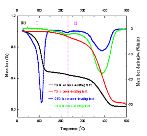 比例為 1:1 的 UP 與 MEKPO 混合的 TG-DTG 如圖 2(a)所示。可見無烘箱測試結(jié)果會產(chǎn)生三個裂解端,由于 UP 中含有 30-40% 之苯乙烯,故判斷第一個階段為苯乙烯的揮發(fā),T01 為 68.60oC;根據(jù)文獻(xiàn),MEKPO 的裂解溫度約為 150oC,故第二階段為 MEKPO 的裂解,T 02 為 166.68 oC;第三階段的裂解溫度與 UP 的裂解溫度比較,有提前的現(xiàn)象,表示 UP 與 MEKPO 發(fā)生了硬化反應(yīng)而產(chǎn)生新的硬化產(chǎn)物,因此此階段為 UP 混合 MEKPO 硬化后產(chǎn)物的裂解,T 03 為 311.42 oC,Tp3 為 338.80oC,最大熱重?fù)p失速率則為 8.61%/min。而有烘箱測試的結(jié)果無前二段的裂解過程,只有產(chǎn)物的裂解,T03 為 311.52oC,Tp3 為 376.38oC,最大熱失重速率則為 16.16%/min。
