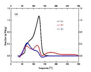 表 1 為 UP 與 MEKPO 在不同混合比例下所做的 DSC 實(shí)驗(yàn)數(shù)據(jù),總反應(yīng)熱(ΔHd)代表物質(zhì)分解時所造成的嚴(yán)重性,從表中可看出在三個比例中,ΔHd, 1:1(857.34J/g)> ΔHd, 3:1(370.30J/g)> ΔHd, 5:1(342.39J/g)。三者中除 ΔHd 1:1 較大外,其余皆相差不多,故可再以起始溫度來判定其危害性,因 T0 代表物質(zhì)分解的難易,T0, 3:1(67.86 oC)> T0, 1:1 (60.77oC)> T0, 5:1 (43.40oC),因此可判定當(dāng)比例為 3:1 時,相較于其他比例為較安全的狀態(tài)。