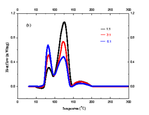 再來進(jìn)行 UP 與 TBPO 混合比例為 1:1、3:1 和 5:1 進(jìn)行的 DSC 實(shí)驗(yàn),由圖 3.3(b)可看出 UP 與 TBPO 的實(shí)驗(yàn)一樣會有二段的波峰出現(xiàn),且隨著 UP 比例的增加,第一段波峰會逐漸上升(85.53 降至 81.85 oC),而第二段波峰會逐漸下降(125.70 降至 124.89oC),與混合 MEKPO 的現(xiàn)象相同,故第一段為硬化反應(yīng)的放熱;而根據(jù)文獻(xiàn),TBPO 的起始溫度約為 98oC 左右,而實(shí)驗(yàn)中第二段分解溫度也約為 100oC,因此判定第二段為 TBPO 的放熱。