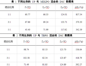 在混合比例為 1:1 時,T0, UP+TBPO(60.77 oC)> T0, UP+MEKPO(98.74 oC),ΔHd, UP+MEKPO(857.34J/g)> ΔHd, UP+TBPO(536.64J/g)。