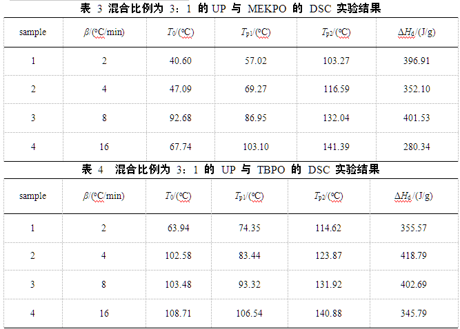 在混合比例為 3:1 時,T0, UP+TBPO(67.86oC)> T0, UP+MEKPO(102.58oC),ΔHd, UP+MEKPO(370.30J/g)> ΔHd, UP+TBPO(418.79J/g)。