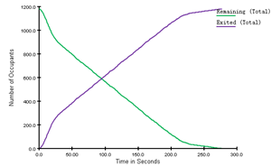 在SFPE模式下模擬中,疏散運動時間為276.53秒,時間與人數(shù)的分布可得到曲線分布圖5