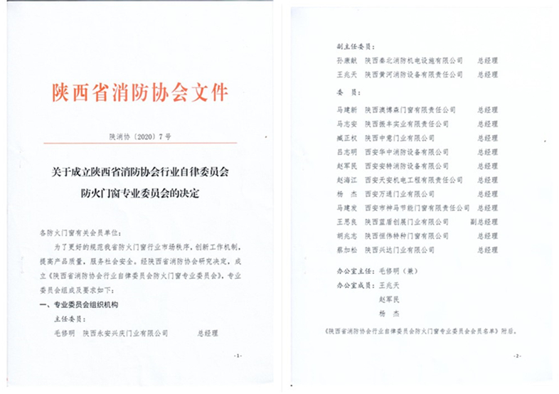 為了更好的規(guī)范我省防火門窗行業(yè)市場秩序,創(chuàng)新工作機制,提高產(chǎn)品質(zhì)量,服務(wù)社會安全。經(jīng)陜西省消防協(xié)會研究決定,成立《陜西省消防協(xié)會行業(yè)自律委員會防火門窗專業(yè)委員會》,專業(yè)委員會組成及要求如下: