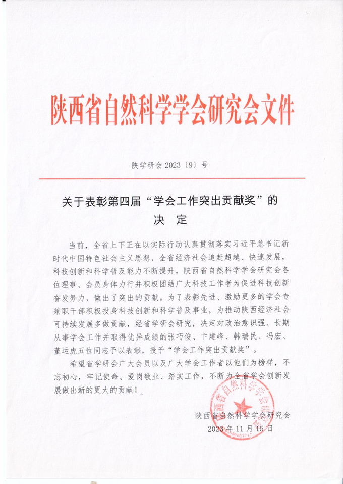 會議傳達了省科協(xié)的有關會議精神,總結(jié)了學研會2023年重點工作,組織與會代表圍繞“新形勢下學會開展繼續(xù)教育的問題與對策”為主題展開了熱烈的發(fā)言和討論,重點表彰了長期從事學會工作、積極投身科技創(chuàng)新和科學普及事業(yè)并取得優(yōu)秀成績的學會干部,我會秘書長卞建峰被授予陜西省自然科學學會研究會第四屆“學會工作突出貢獻獎”。