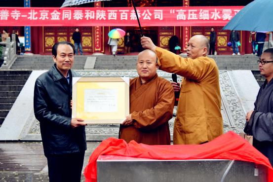本次活動(dòng)由大興善寺監(jiān)寺法師羅福主持。陜西百赫實(shí)業(yè)有限公司總經(jīng)理李玉宏和北京金同泰科技有限公司董事長郭文琪在捐贈(zèng)儀式上作了精彩的講話,羅福法師代表寺院方分別為兩家企業(yè)頒發(fā)了《功德證書》。