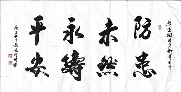 為進(jìn)一步搞好消防科普宣傳工作,弘揚(yáng)消防精神,創(chuàng)作出更多消防科普宣傳作品,讓全社會(huì)進(jìn)一步了解消防、關(guān)心消防,8月21日省書(shū)法協(xié)會(huì)副主席王剛、中國(guó)國(guó)畫(huà)研究院陜西分院院長(zhǎng)曾祥斌、西安皇都書(shū)畫(huà)藝術(shù)研究院院長(zhǎng)石溪、陜西神州書(shū)畫(huà)研究院常務(wù)副院長(zhǎng)董瑞琦和陜西秦源書(shū)畫(huà)院副院長(zhǎng)張明琦一行五人蒞臨省消防協(xié)會(huì)為“2020年全國(guó)優(yōu)秀消防科普宣傳教育作品大賽”創(chuàng)作消防科普書(shū)法作品。
