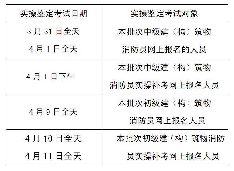 根據(jù)前期報(bào)名情況,現(xiàn)定于2018年3月31日至4月1日組織中級(jí)建(構(gòu))筑物消防員實(shí)操鑒定考試和實(shí)操補(bǔ)考考試,4月9日至4月11日組織初級(jí)建(構(gòu))筑物消防員實(shí)操鑒定考試和實(shí)操補(bǔ)考考試,3月25日組織全國(guó)理論統(tǒng)考(理論統(tǒng)考具體事宜可查看“陜西省消防協(xié)會(huì)”網(wǎng)站通知公告欄的詳細(xì)通知)。現(xiàn)將實(shí)操鑒定考試和實(shí)操補(bǔ)考時(shí)間安排公告如下: