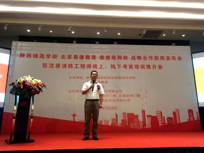 陜西瑞晟消防職業(yè)技能培訓學校校長李堅斌對到場的領導、媒體等嘉賓表示誠摯的感謝,他講到,我國注冊消防工程師考試推行以來,我省通過人數僅有155人,遠遠落后于社會消防安全的需要和廣大企業(yè)對高素質消防技術人才的需求。瑞晟培訓學校擁有良好的辦學條件和雄厚的師資力量,是省內第一所具有消防職業(yè)技能培訓資質專業(yè)機構,北京易建教育憑借豐富的注冊消防工程師培訓經驗與優(yōu)秀的師資力量,壹壹玖網校憑借成熟的線上教育平臺,三家教育機構優(yōu)勢互補,力爭為我省消防事業(yè)的發(fā)展提供有力的人才保障。
