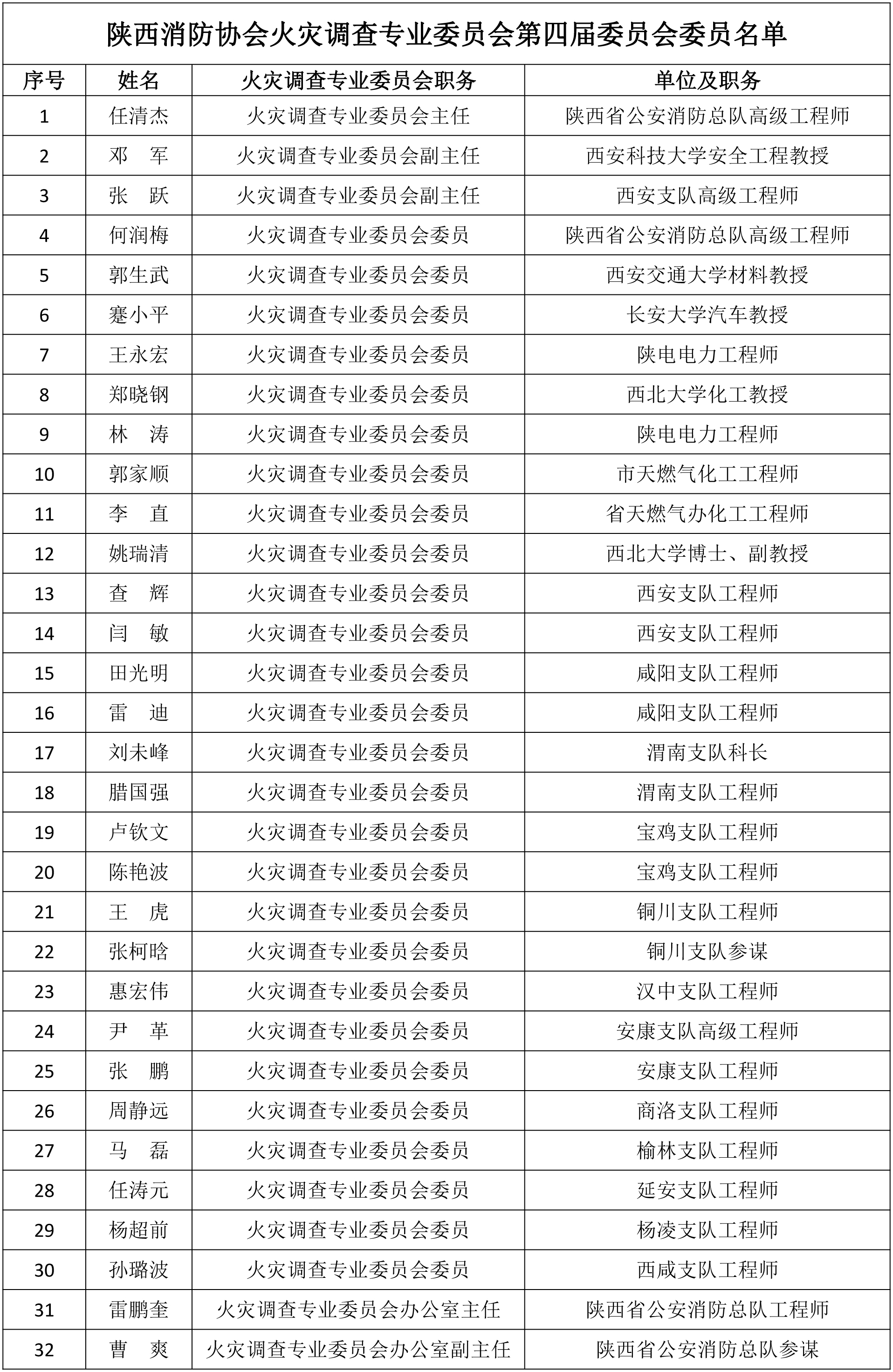 任清杰被聘任為陜西省消防協(xié)會(huì)火災(zāi)調(diào)查專(zhuān)業(yè)委員會(huì)第四屆委員會(huì)主任委員;鄧軍、張躍被聘任為陜西省消防協(xié)會(huì)火災(zāi)調(diào)查專(zhuān)業(yè)委員會(huì)第四屆委員會(huì)副主任委員;何潤(rùn)梅、郭生武、蹇小平等27人被聘任為第四屆委員會(huì)委員。(詳細(xì)名單附后)