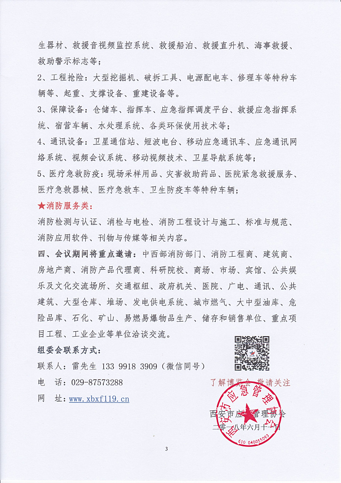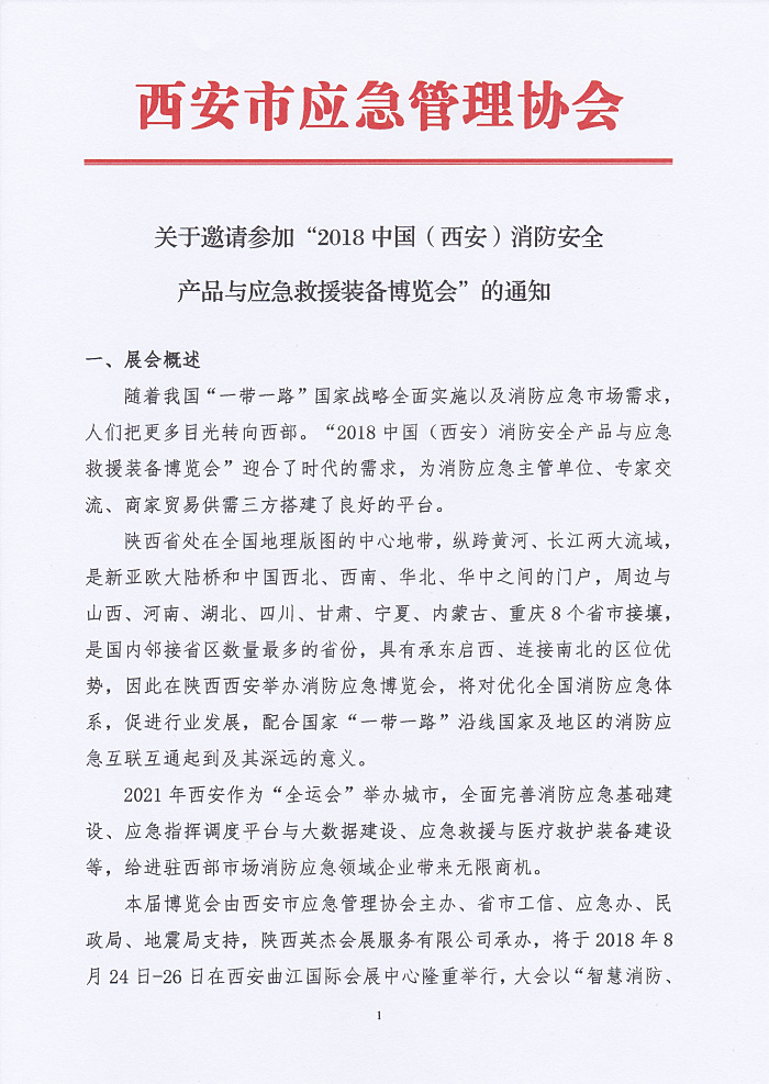 由西安市應(yīng)急管理協(xié)會主辦、省市工信、應(yīng)急辦、民政局、地震局支持,陜西英杰會展服務(wù)有限公司承辦的“2018中國(西安)消防安全產(chǎn)品與應(yīng)急救援裝備博覽會”,將于2018年8月24日-26日在西安曲江國際會展中心隆重舉行,大會主題為“智慧消防、創(chuàng)新應(yīng)用”。