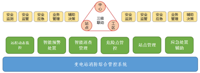 變電站消防綜合管控系統(tǒng)平臺包括安全遠程動態(tài)監(jiān)控應(yīng)用、智能預(yù)警及處置應(yīng)用、智能巡查管理應(yīng)用、危險點管控應(yīng)用、站點管理應(yīng)用、應(yīng)急處置輔助應(yīng)用、等六大應(yīng)用,各應(yīng)用又包括若干個功能模塊,各功能之間有機銜接,構(gòu)成一個完整的系統(tǒng)功能體系,構(gòu)建統(tǒng)一的消防安全智能防控系統(tǒng)。