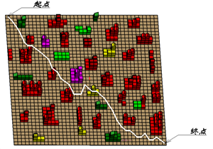 (xs,ys),(xf,yf)分別代表路徑起始點與終點坐標(biāo)。此設(shè)計將兩個因素綜合在一個函數(shù)中,實現(xiàn)了量化的統(tǒng)一。路徑長度越小,與障礙相交次數(shù)越少,則適應(yīng)度函數(shù)值越大。