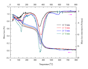 (1)第一組:用 UP 進(jìn)行不同的升溫速率實(shí)驗(yàn),分別為 10,15,20,和 25oC/min,溫度范圍設(shè)定為 30–800oC。