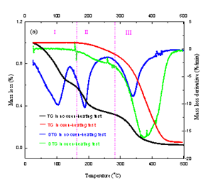 比例為 1:1 的 UP 與 MEKPO 混合的 TG-DTG 如圖 2(a)所示。可見無烘箱測試結(jié)果會產(chǎn)生三個裂解端,由于 UP 中含有 30-40% 之苯乙烯,故判斷第一個階段為苯乙烯的揮發(fā),T01 為 68.60oC;根據(jù)文獻(xiàn),MEKPO 的裂解溫度約為 150oC,故第二階段為 MEKPO 的裂解,T 02 為 166.68 oC;第三階段的裂解溫度與 UP 的裂解溫度比較,有提前的現(xiàn)象,表示 UP 與 MEKPO 發(fā)生了硬化反應(yīng)而產(chǎn)生新的硬化產(chǎn)物,因此此階段為 UP 混合 MEKPO 硬化后產(chǎn)物的裂解,T 03 為 311.42 oC,Tp3 為 338.80oC,最大熱重?fù)p失速率則為 8.61%/min。而有烘箱測試的結(jié)果無前二段的裂解過程,只有產(chǎn)物的裂解,T03 為 311.52oC,Tp3 為 376.38oC,最大熱失重速率則為 16.16%/min。