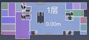 根據(jù)建筑圖紙上的參數(shù)設(shè)置樓層分別為0m、6.0m、7.7m(第二層的錯層)、11.1m、總計三層。參照導(dǎo)入的CAD文件作為模板,定義地板、門(內(nèi)門和出口)、墻、樓梯等。為了近乎真實模擬疏散情況,地板僅定義人群可活動的區(qū)域,電梯、內(nèi)墻障礙物等在模型中不給予定義。各房間的墻、各房間的面積大小、門的寬度以及樓梯的設(shè)置完全依照建筑設(shè)計圖建立。考慮到真實性,第二層和頂層的錯層也設(shè)定了不同的相對高度,并用樓梯連接相連樓層。
