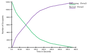 在SFPE模式下模擬中,疏散運動時間為276.53秒,時間與人數(shù)的分布可得到曲線分布圖5