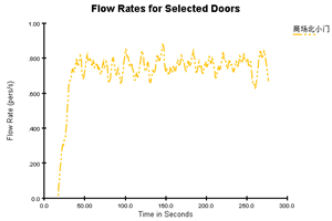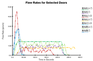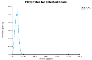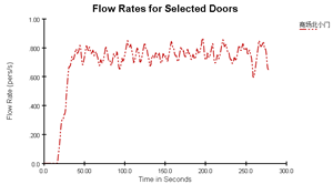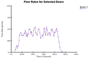 由于商城中人員密度大,疏散速度與路徑和門的大小有較大關(guān)系,因此我們用Pathfinder提供的出入口流通率的數(shù)據(jù)進行研究。