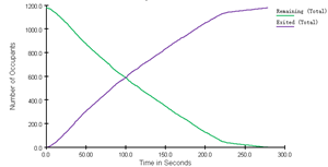 分析:在模型中關(guān)閉次入口和西門兩個安全出口后發(fā)現(xiàn)通過率低且擁擠度高的安全出口的減少幾乎不改變疏散時間反而會增加了疏散效率。其原因在于:某些安全出口的數(shù)量雖然減少,但是疏散人群的分流會提高一些安全出口的利用率并且降低了一些安全出口的擁擠度,最終導(dǎo)致疏散效率的極大提高。