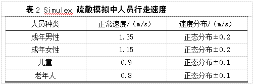 對于不同人員類型疏散時的行走速度我們參考同為疏散仿真軟件Simulex的分布。速度分布使用正態(tài)分布,為了反應(yīng)較大的離散程度,標(biāo)準(zhǔn)差采用軟件自帶的系數(shù)1。見表2。