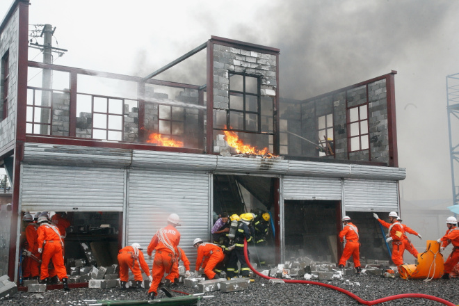 什么是吸引人眼球的大片?除了畫面構(gòu)圖以及拍攝角度獨(dú)特外,場面的宏大和多人物是形成震撼效果的最佳元素。這幅照片拍攝于一次消防綜合項目演練。偵察、滅火、救人、搜索各項動作一氣呵成、齊頭并進(jìn),形成了一幅火線救援的壯麗畫面。
