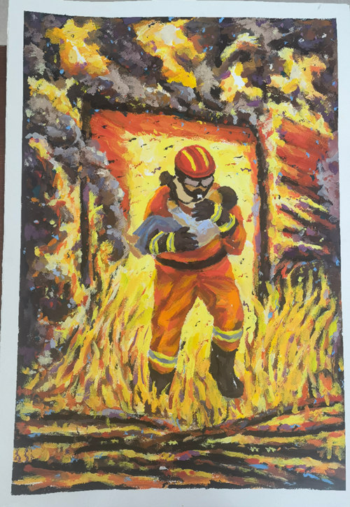 作品簡(jiǎn)介:從水粉繪畫(huà)中,表現(xiàn)出消防救援人員在熊熊烈火中逆行而上創(chuàng)造生命的奇跡。