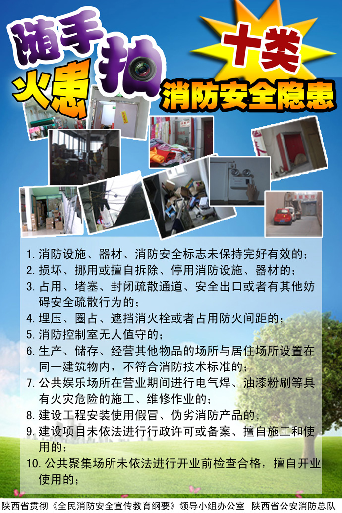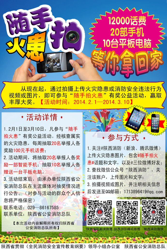 為進(jìn)一步增強(qiáng)全民消防安全意識(shí),動(dòng)員社會(huì)各界群眾廣泛參與火災(zāi)隱患排查整治工作,有效預(yù)防和遏制各類火災(zāi)事故的發(fā)生,由陜西省貫徹《全民消防安全宣傳教育綱要》領(lǐng)導(dǎo)小組辦公室主辦,陜西省公安消防總隊(duì)承辦,從2014年2月1日至2014年3月10日,在全省開展“隨手拍火患”有獎(jiǎng)公益活動(dòng)。