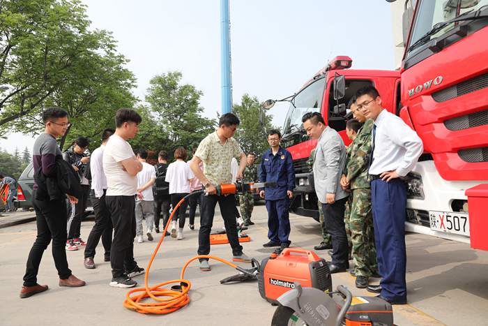 活動中,工業(yè)園中隊的消防員先后介紹了中隊結(jié)構(gòu)、隊伍建設(shè)、職能分工及消防車輛的功能用途,演示了無齒鋸、液壓救援設(shè)備、自救式呼吸器使用等操作,并且就爬繩、掛鉤、6米拉梯等項目進行了現(xiàn)場演練,隨后還帶領(lǐng)大家體驗了消防服的試穿,滅火器的使用。