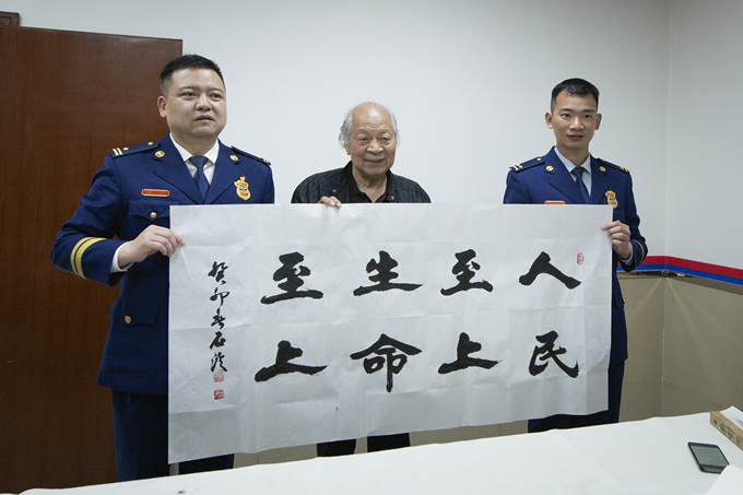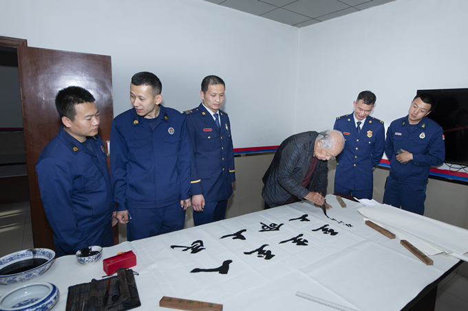 在賈西海會(huì)長(zhǎng)帶領(lǐng)下,西安皇都書(shū)畫(huà)藝術(shù)研究院石溪院長(zhǎng)等、著名書(shū)畫(huà)家、攝影家一行來(lái)到西安市高新區(qū)創(chuàng)匯路消防救援站為指戰(zhàn)員們送去關(guān)心與慰問(wèn)。藝術(shù)家們參觀了營(yíng)區(qū)建設(shè)情況,聽(tīng)取了消防裝備器材知識(shí)講解,觀摩了消防員各項(xiàng)滅火救援技能演練,從而對(duì)消防基層工作有了全新的認(rèn)識(shí)、全面的了解。
