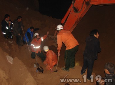 11月28日18時49分,陜西渭南市站北路消防中隊接到群眾報警稱,市臨渭區(qū)保豐4組鋼材廠內的一施工工地突然塌方,其中有4名工人被土方埋壓生死未卜,請求緊急救援。接到報警后,中隊迅速出動兩輛消防車和11名救援官兵迅速趕赴事發(fā)現(xiàn)場,50分鐘成功將被困工人救出。