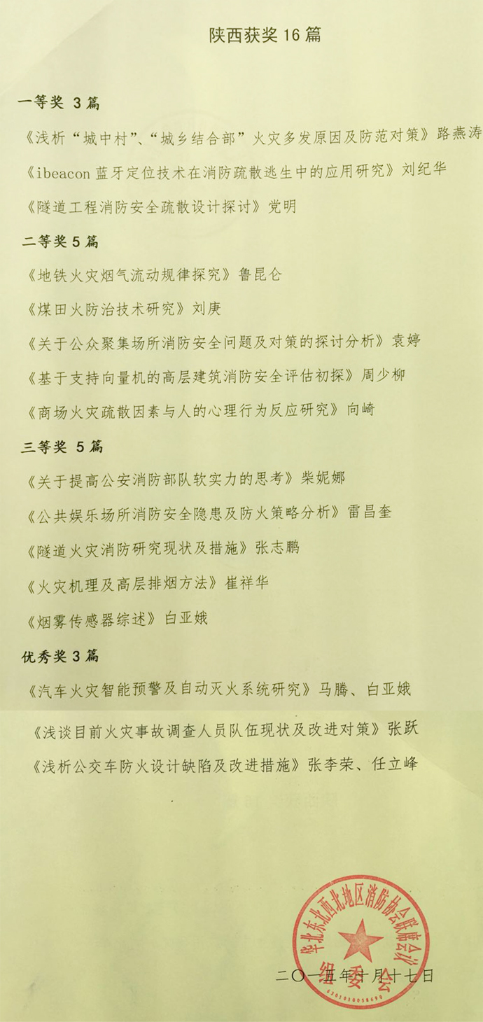陜西消防協(xié)會(huì)十分重視這次消防學(xué)術(shù)論文征集工作。為了向“三北消防協(xié)會(huì)聯(lián)席會(huì)”報(bào)送高質(zhì)量的論文,早在今年三月就論文征集活動(dòng)進(jìn)行廣泛宣傳,并對(duì)報(bào)送上來(lái)的論文,從隊(duì)伍管理和滅火救援、消防監(jiān)督、防滅火技術(shù)、消防法治等幾個(gè)方向組織相關(guān)專家進(jìn)行篩選,向“三北”消防協(xié)會(huì)聯(lián)席會(huì)議推薦報(bào)送了22篇文章,經(jīng)過(guò)聯(lián)席會(huì)組織專家評(píng)選,陜西消防協(xié)會(huì)報(bào)送的論文共有16篇獲獎(jiǎng),其中3篇獲一等獎(jiǎng),5篇獲二等獎(jiǎng),5篇獲三等獎(jiǎng),3篇獲優(yōu)秀獎(jiǎng)。獲獎(jiǎng)?wù)撐木幹瞥伞度A北、東北、西北地區(qū)消防協(xié)會(huì)第十一屆聯(lián)席會(huì)議論文集》。陜西消防協(xié)會(huì)會(huì)長(zhǎng)賈西海代表協(xié)會(huì)出席會(huì)議,并領(lǐng)取了獎(jiǎng)牌和獲獎(jiǎng)證書(shū)。