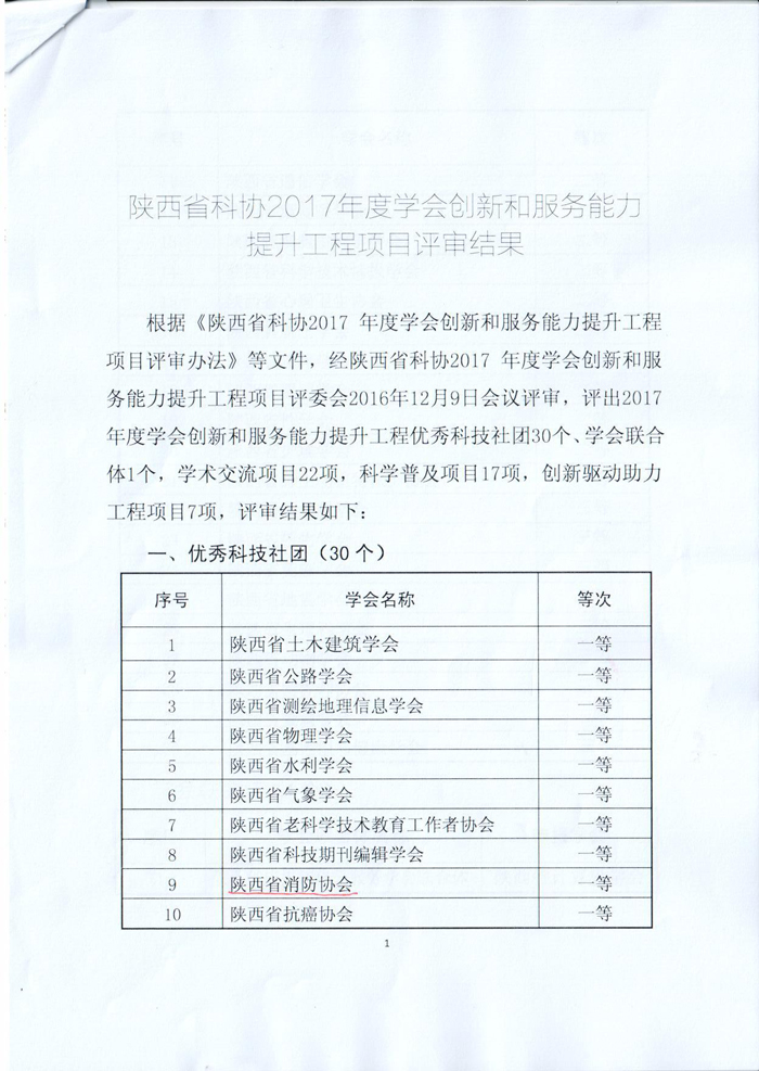 近日,陜西省科學(xué)技術(shù)協(xié)會(huì)發(fā)布了《陜西省科協(xié)2017年度學(xué)會(huì)創(chuàng)新和服務(wù)能力提升工程項(xiàng)目評(píng)審結(jié)果》,陜西省消防協(xié)會(huì)榮獲“優(yōu)秀科技社團(tuán)”一等獎(jiǎng)。