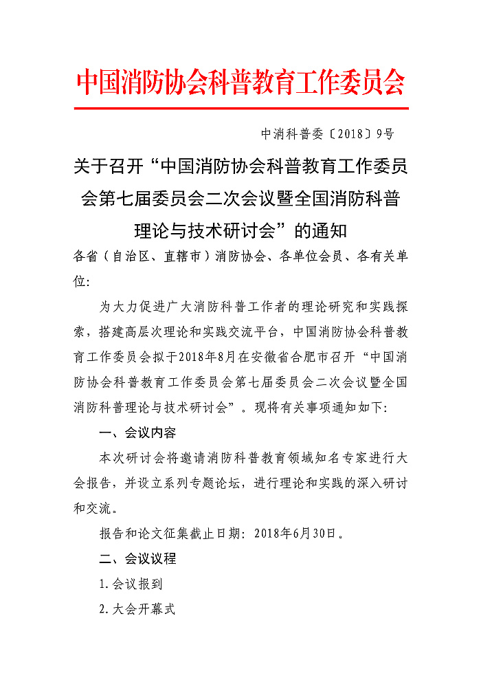 轉(zhuǎn)發(fā)《關(guān)于召開“中國(guó)消防協(xié)會(huì)科普教育工作委員會(huì)第七屆委員會(huì)二次會(huì)議暨全國(guó)消防科普理論與技術(shù)研討會(huì)”的通知》