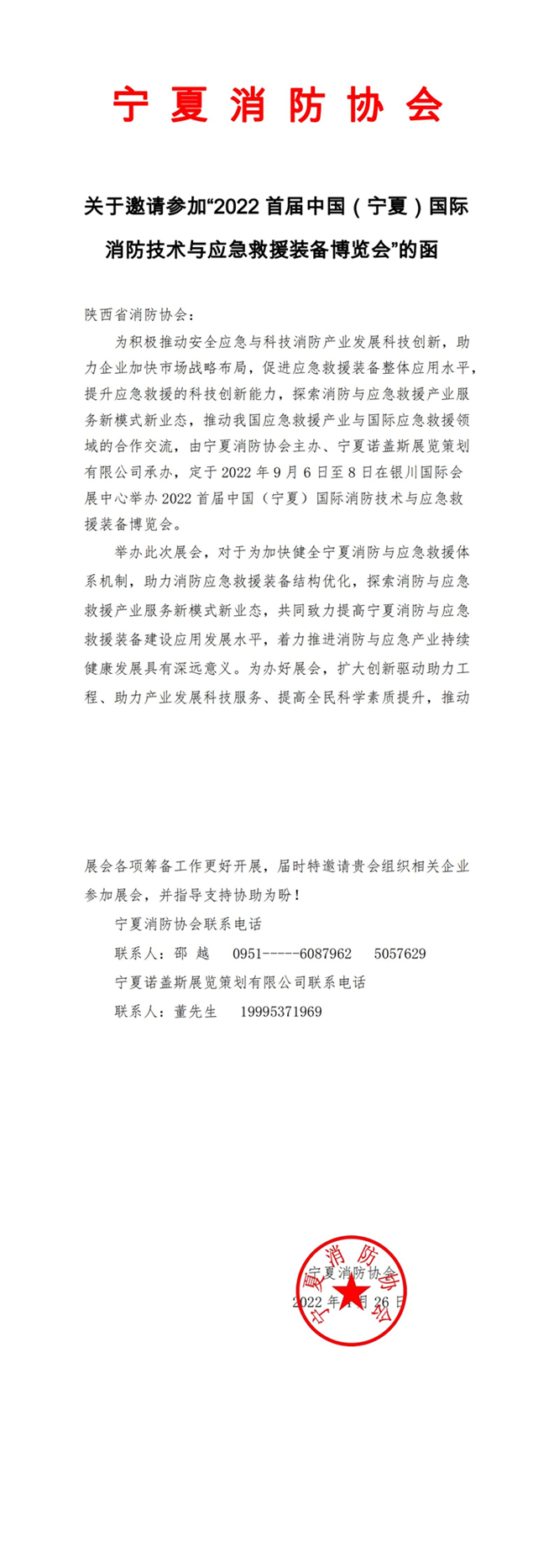 現(xiàn)將寧夏消防協(xié)會(huì)《關(guān)于邀請(qǐng)參加“2022首屆中國(guó)(寧夏)國(guó)際消防技術(shù)與應(yīng)急救援裝備博覽會(huì)”的函》轉(zhuǎn)發(fā)你們,望各單位結(jié)合各自情況自愿參觀。